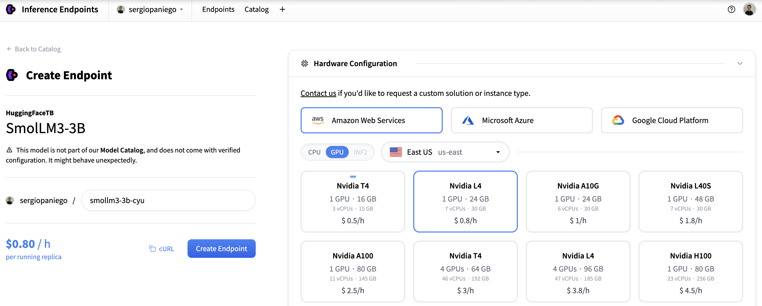 对于本次演示,我们选择 AWS 和 L4 GPU。请根据您的硬件需求进行调整。 -
