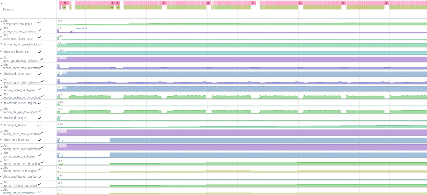 由于推理服务的动态特性——提示和解码可能在不可预测的时间表中到达并运行很长时间——因此,了解实际执行情况通常很有用。高层级剖析不能准确地表示提示或解码阶段的实际执行时间。此限制是由于使用了异步测量方法。例如,在涉及延迟采样或多步调度的场景中,系统会避免仅为了指示设备何时暂停执行而将主机与设备同步。这样做会严重影响性能。因此,为每个提示或解码阶段记录的时间仅反映主机端的时间,应谨慎解释。
