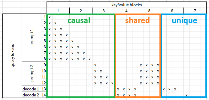 当多个 token 共享单个上下文块时,使用共享注意力。当存在带有已缓存部分上下文的提示,或在多个样本共享通用前缀的解码期间,通常会发生这种情况。由于共享块被使用多次,因此所有共享块都会被获取并与所有查询 token 相乘。通常,与整个 KV 缓存相比,共享块的数量相对较少,这使得获取它们比依赖于 contiguous_pa 等技巧更好。主要挑战在于创建 shared_bias。