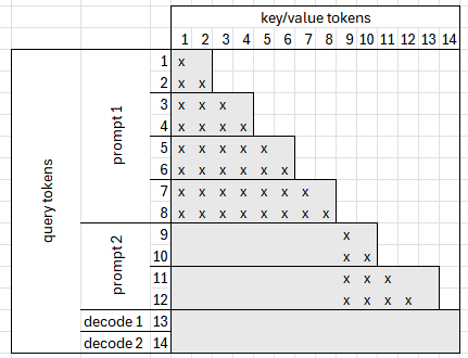 因果注意力用于计算当前计算的 Q、K 和 V 之间的注意力值。由于这些数据最近已计算,因此无需从 KV 缓存中获取。提示长度通常远长于 max_num_seqs。这意味着我们无需区分在提示中使用哪些 token 以及在解码中使用哪些 token,而是依赖于注意力偏置来屏蔽不必要的 token。由于我们顺序使用所有查询 token,因此它的工作方式类似于合并的预填充功能。以下示例展示了计算出的因果偏置可能的样子: