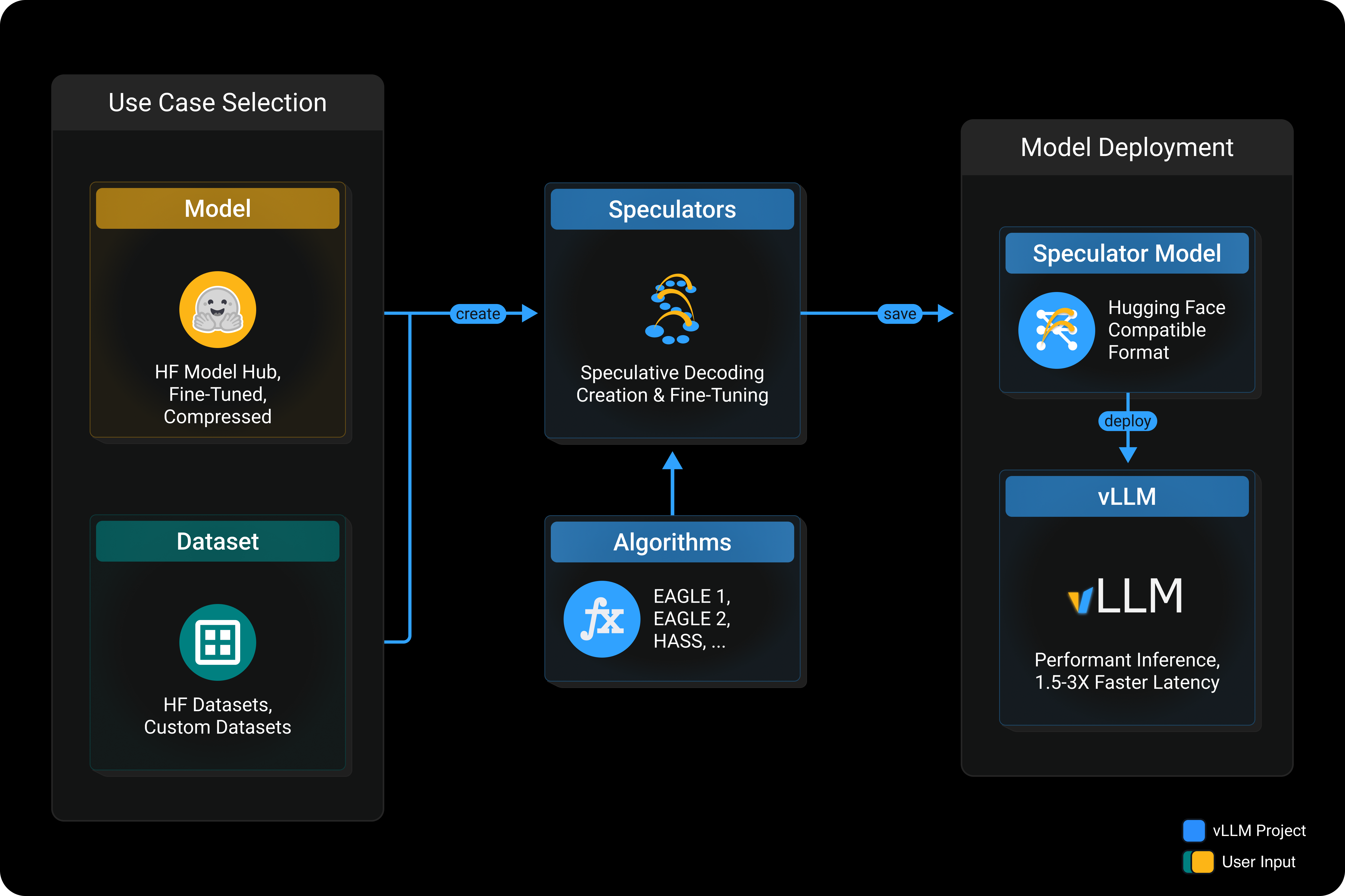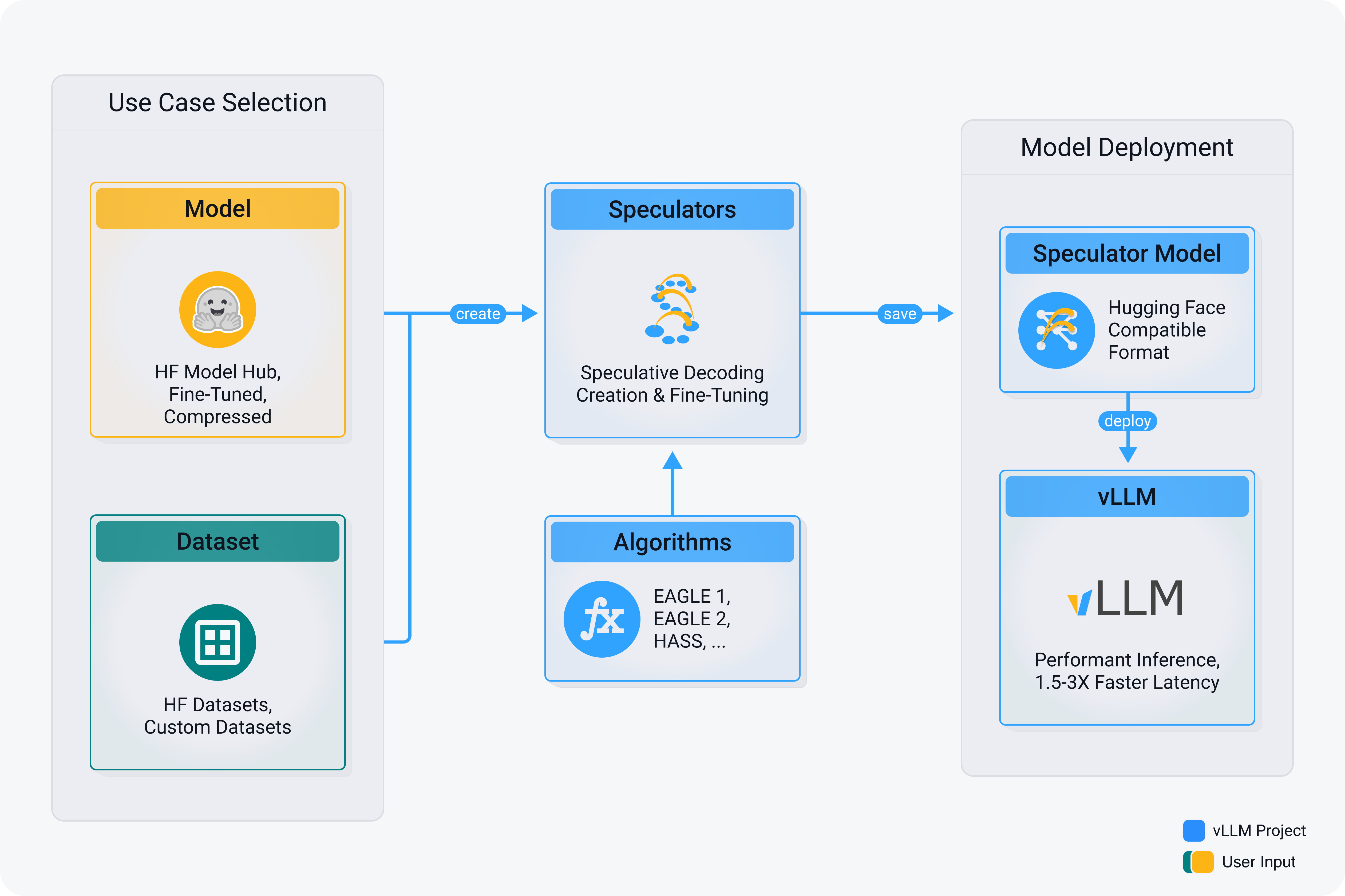 Speculators 是一个开放、统一的库,用于创建和存储用于高效 LLM 推理的投机解码算法。它与 Hugging Face 格式集成,并与 vLLM 配对用于生产服务。